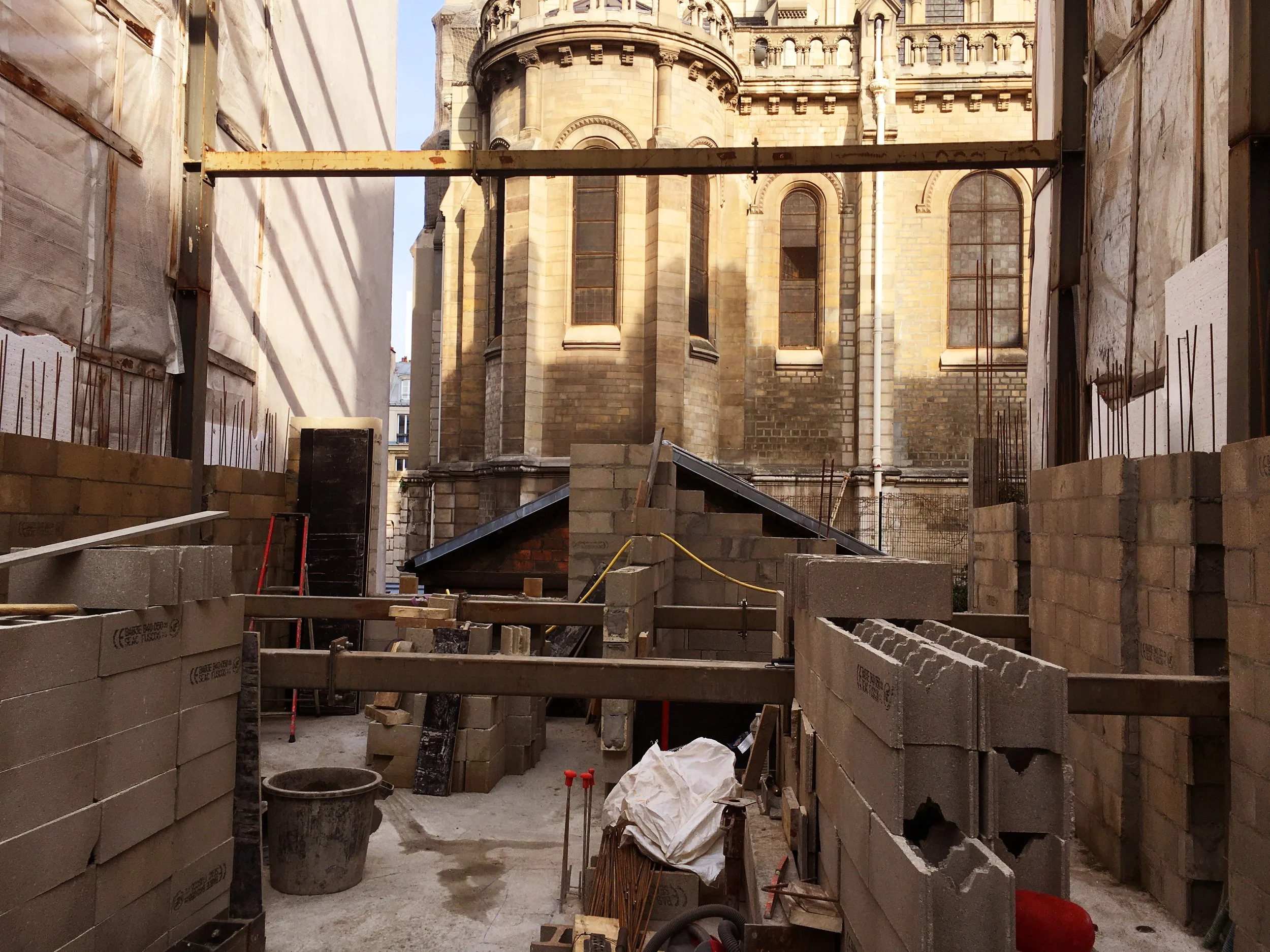 Création d’un immeuble neuf de 3 logements et d’un local commercial. Le projet s’articule autour d’une cours paysagée en fond de parcelle, située deux étages sous le niveau de la rue de Ménilmontant, au pied de l’église Notre Dame de la Croix.